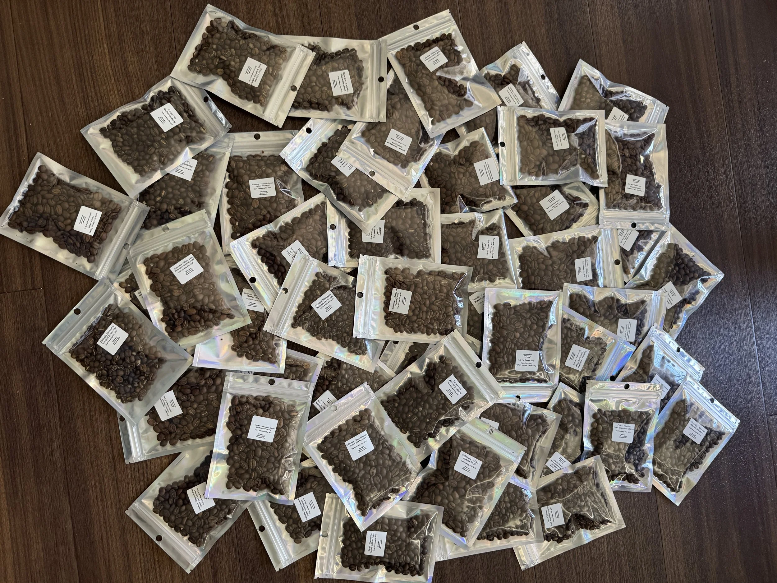 I like to travel with a rough idea of how many beans I’ll need, and pack them up in single doses in the comfort of my own home. 5min of packing comfortably at home will save me a couple steps in my brews in the hotel room. I don’t recommend test tubes since they take up the same space when full vs. empty. Instead I use mylar bags that pack flat. 3x4” bags hold up to 20g, 4x6” bags hold a little over 60g.